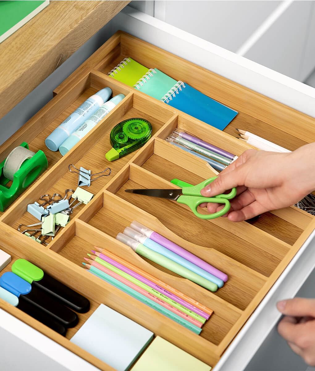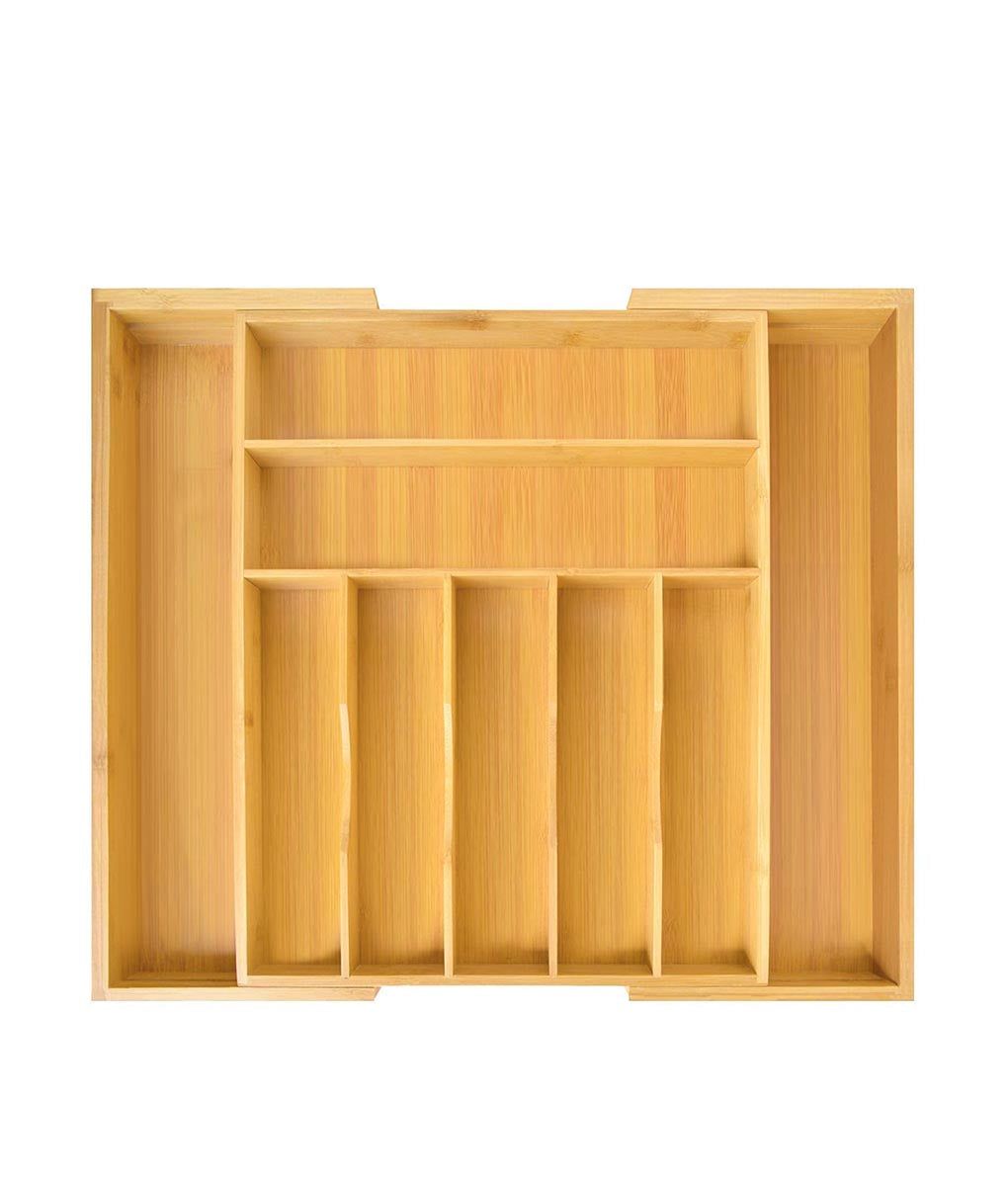This silverware drawer organizer includes adjustable storage slots, making it an ideal storage solution for culinary tools and tableware.
